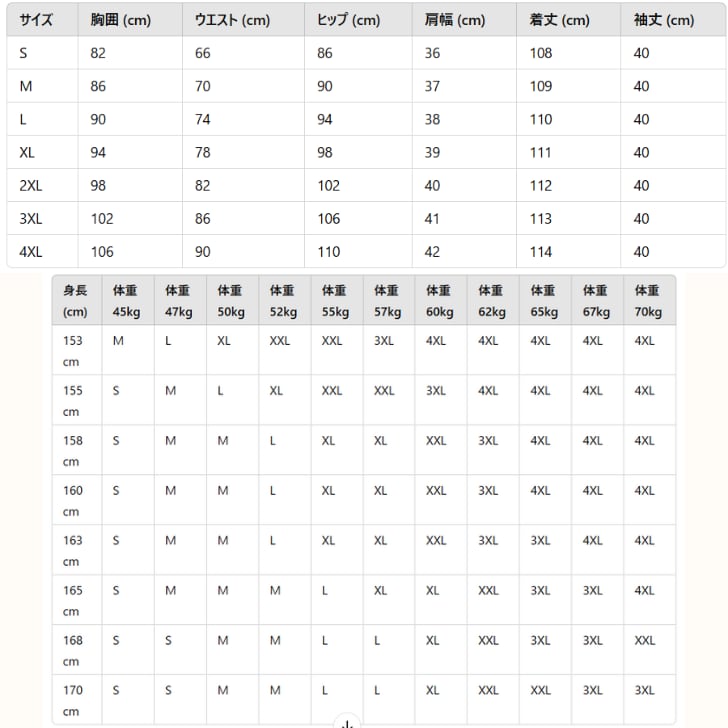 サイズ展開: S~4XLまで、幅広い体型に対応したサイズをご用意